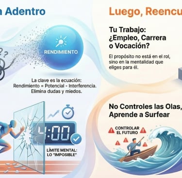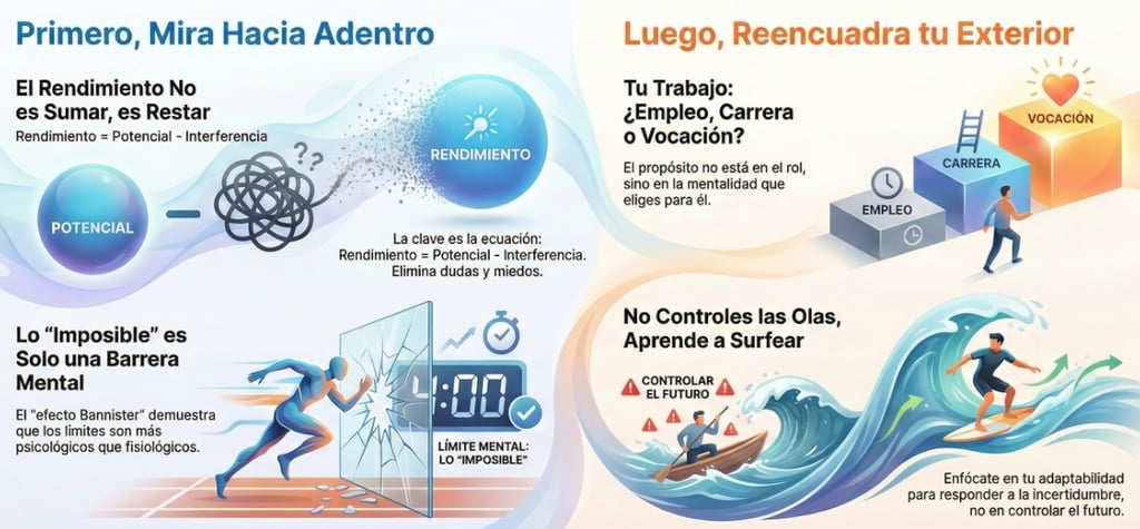 El estancamiento rara vez es un muro físico; es una jaula mental. La ecuación de Gallwey nos da la llave (restar), la historia de Bannister nos muestra que la cerradura no es tan fuerte como parece (límites), el estudio de Wrzesniewski nos recuerda por qué queremos salir (propósito), y la metáfora del surfista nos enseña a navegar el mundo una vez que somos libres (adaptabilidad).